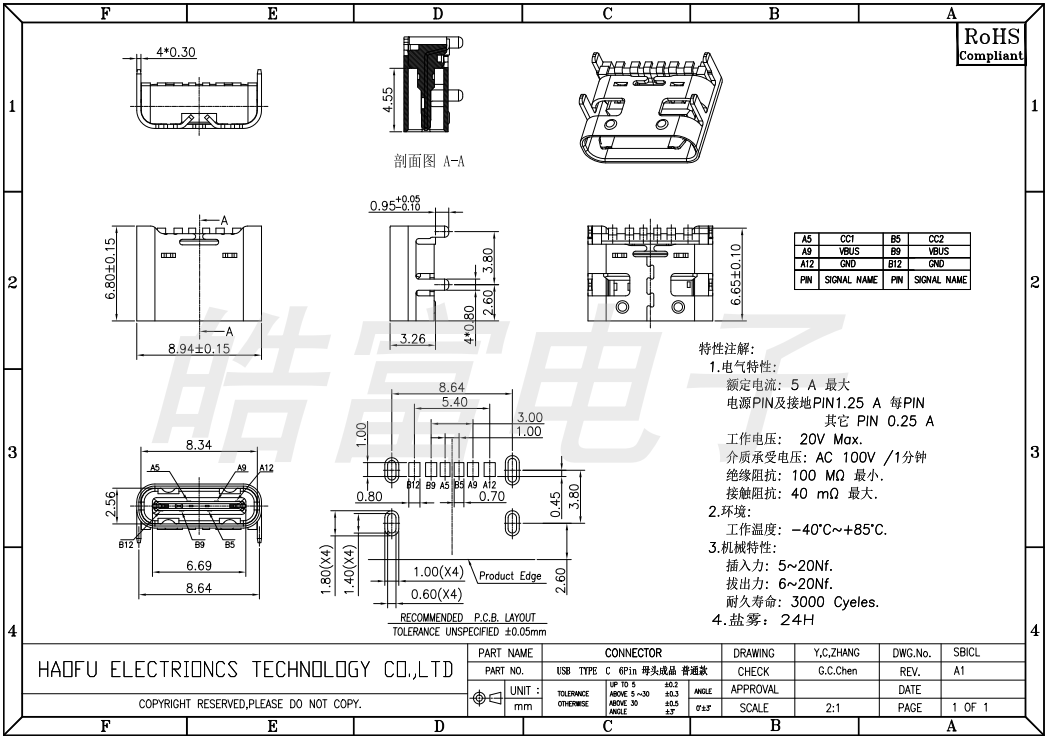 USB connector 1006-FGB012-C TYPE-C 6PIN female socket