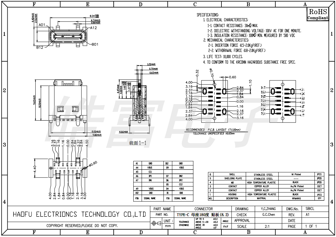 USB connector TYPE-C female socket 180 degree mounting board (8.2)