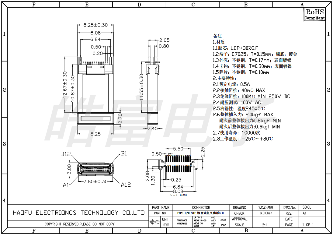 USB connector TYPE-CM SMT 24PIN rivet type thick 3.0 harpoon foot 1.65