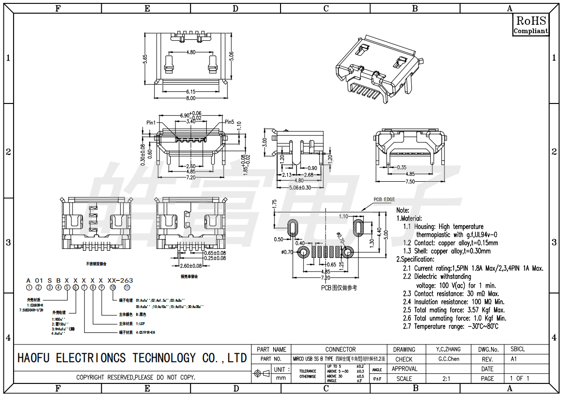 MIRCO USB connector 5S B TYPE, four-pin full insertion (bull-type), short pin length, version 1.2-1