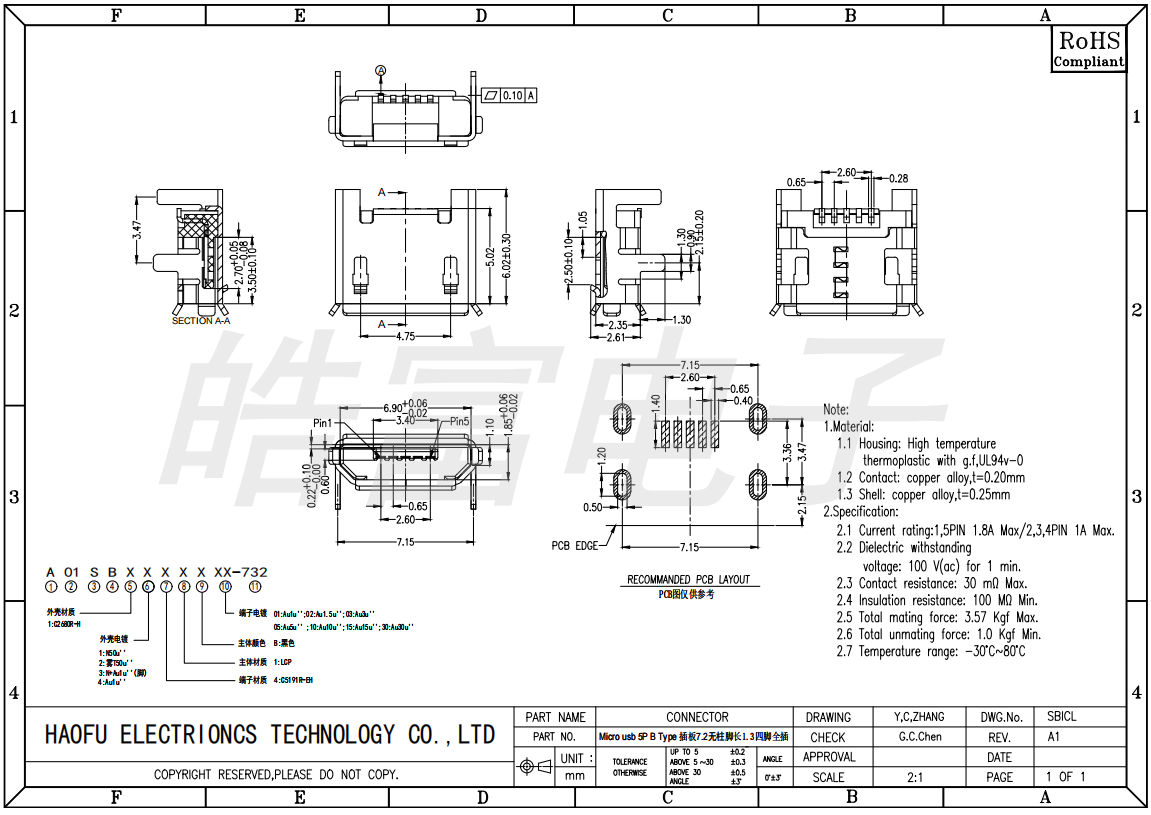 Micro USB 5P Type B plug board, 7.2 without standoffs, length 1.3, fully pluggable with all four legs