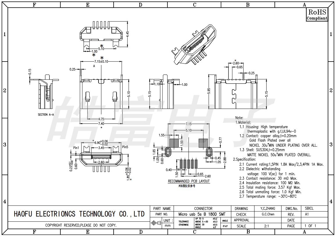 MICRO 5P female seat B-type 180 degree flat mouth vertical sticker stainless steel bright nickel 3