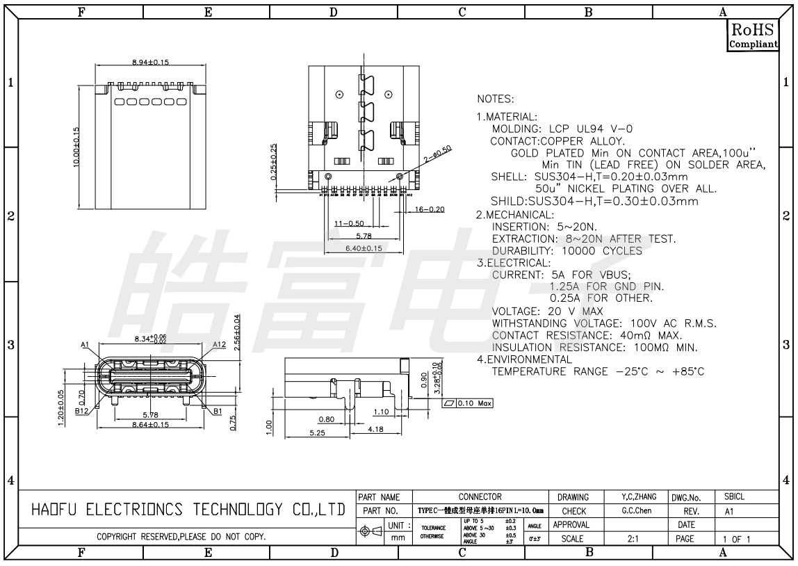 TYPE C one-piece integrated female socket, single row 16PIN, L=10.0mm, 1