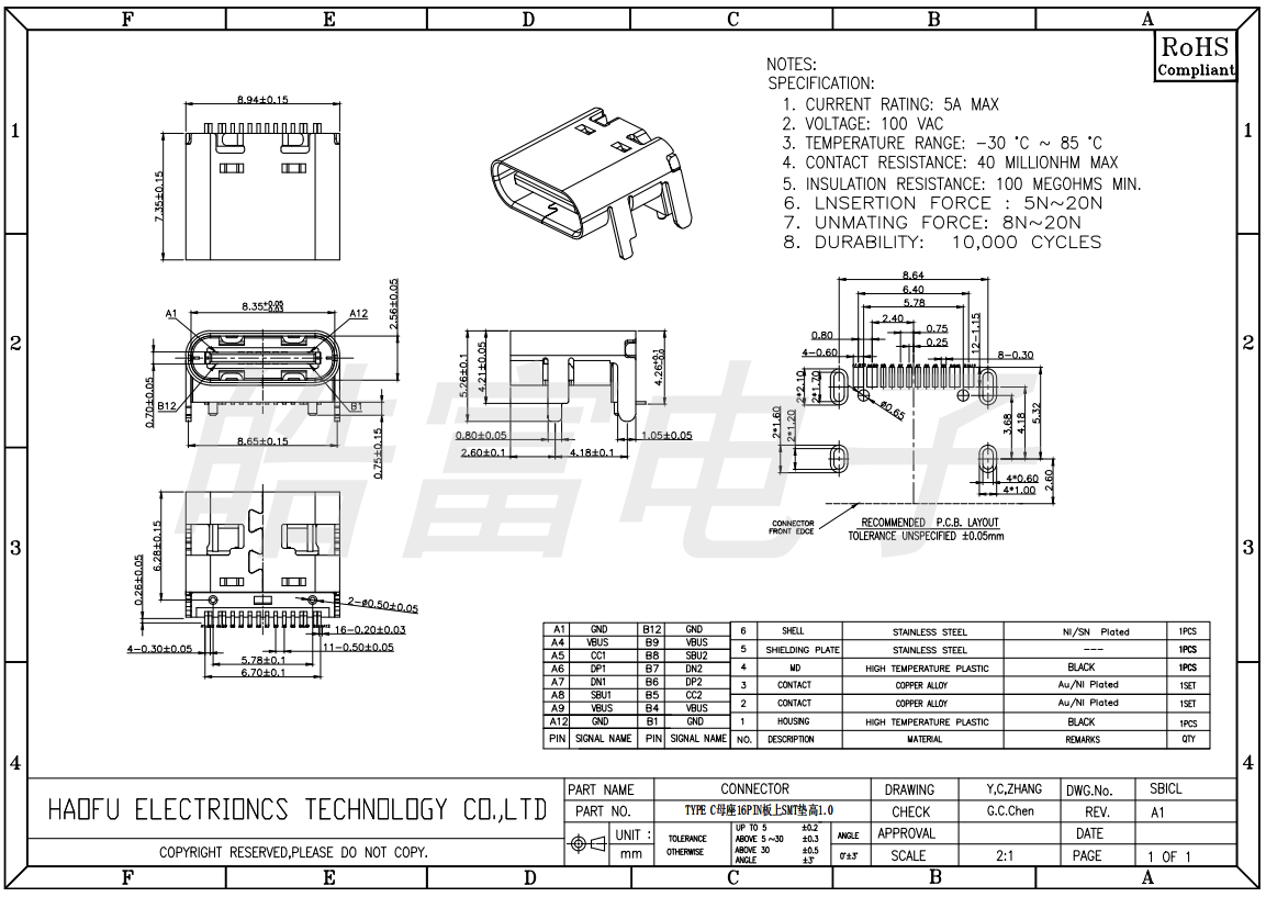 TYPE C female socket 16PIN board SMT pad height 1.0 1