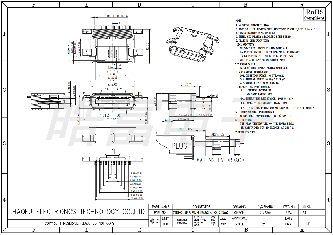 TYPE-C 16P 母座L=6.5沉板2.4 CH=0.82mm 1