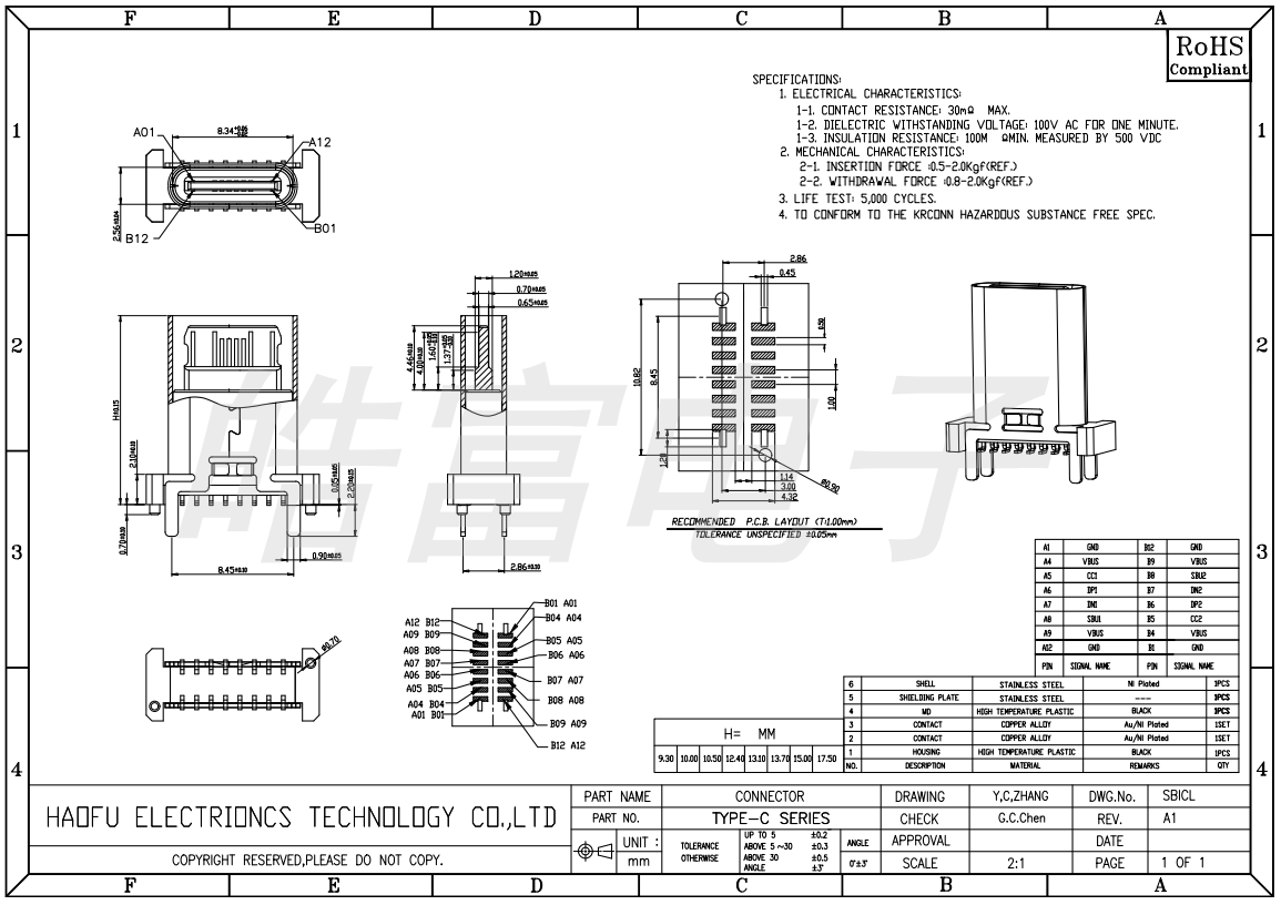 TYPE-C 16PIN vertical four-pin full insertion SMD H9.3-17.5