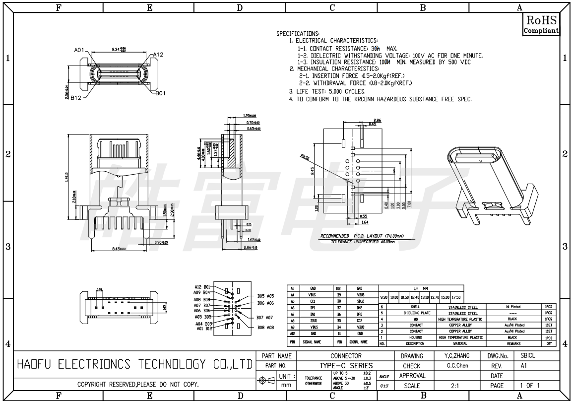 TYPE-C 12PIN vertical plug board H9.3-17.5 (17.5 1.4)