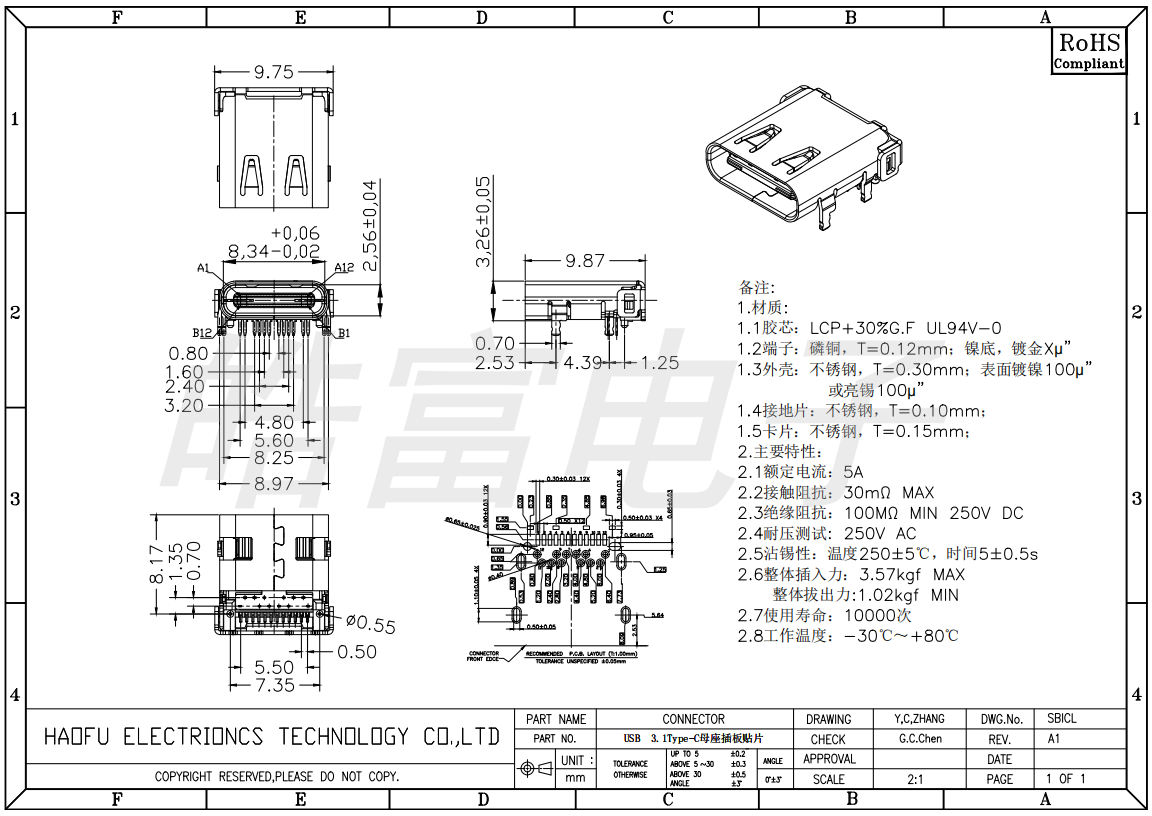 HF-036-001 USB 3.1 TYPE-C female socket front-insert patch 24P