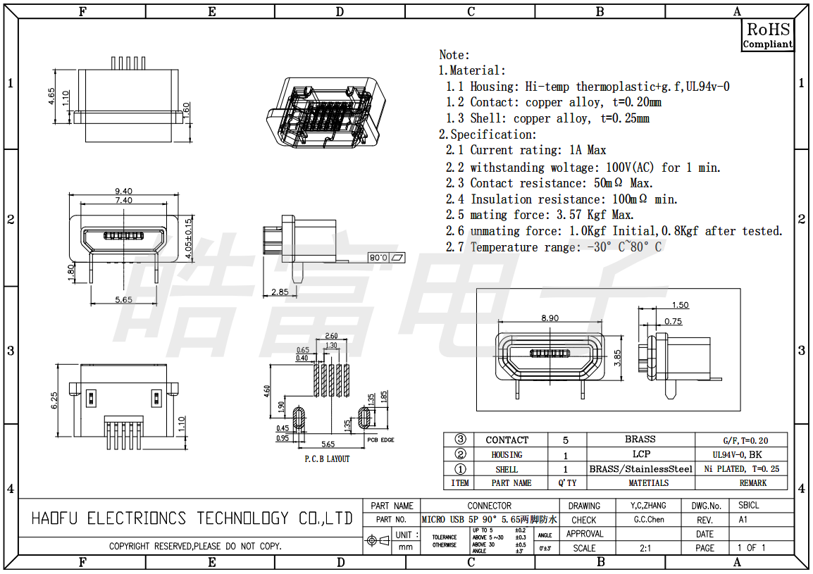 MICRO USB-5P F 90 ° 5.65 Two Foot Waterproof