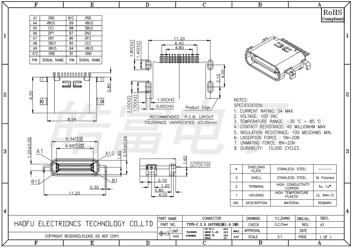 TYPE-C 2.0 16PIN sinking board 1.6 3MD 1