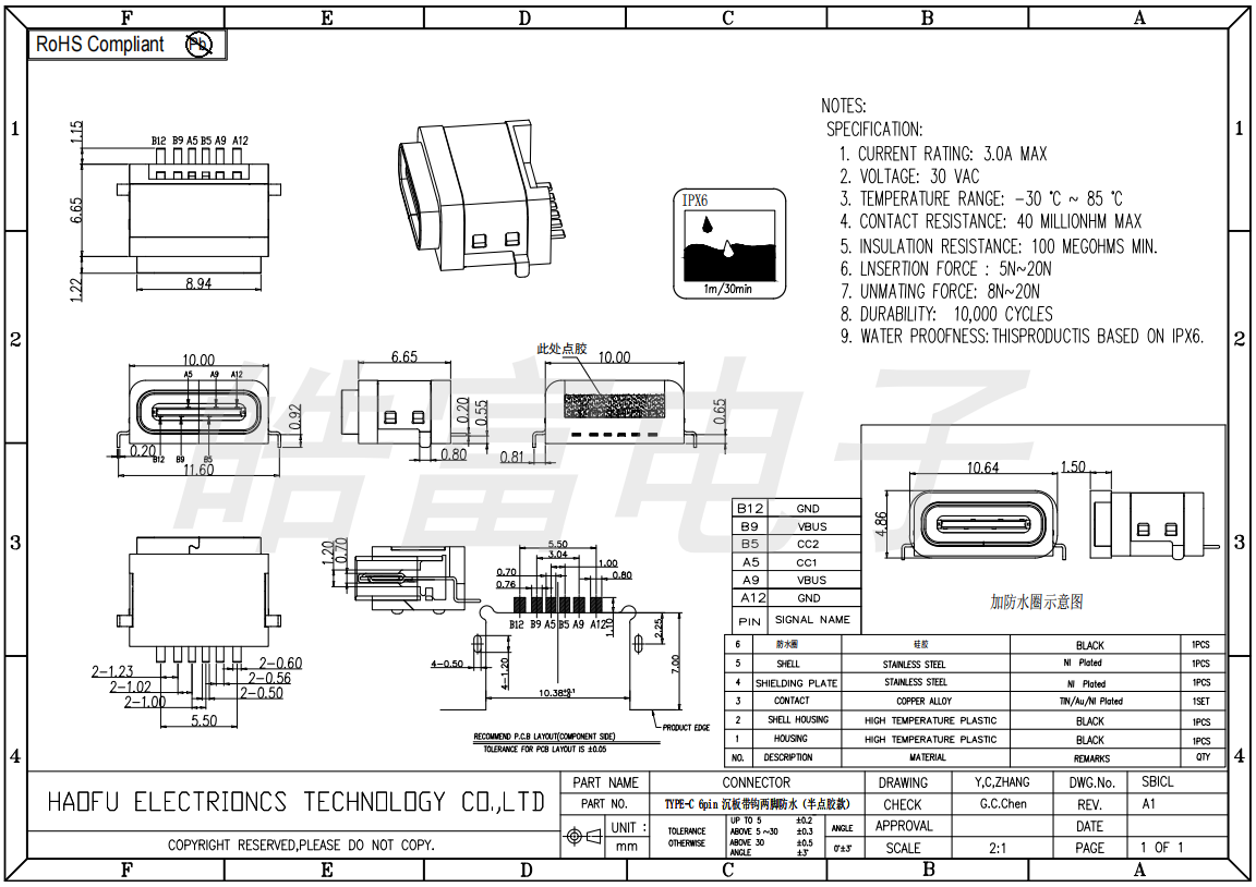 TYPE-C 6-pin sinking board with hook and two feet waterproof (half point adhesive version) 1