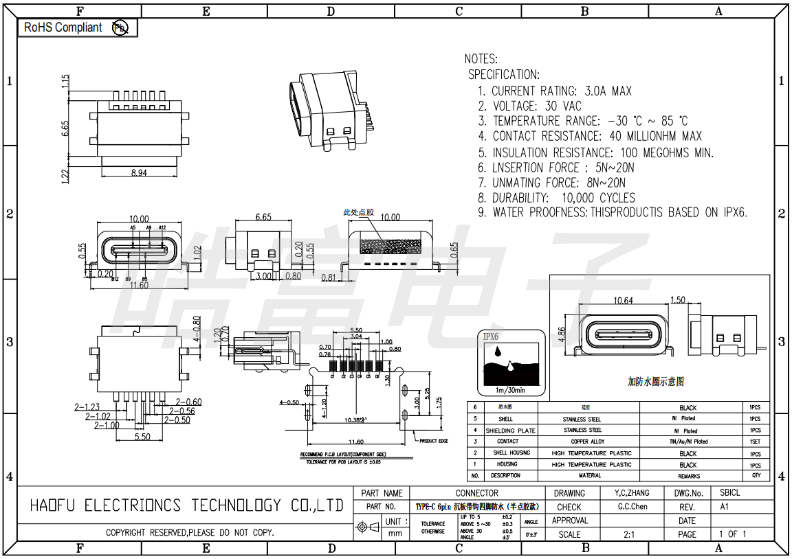 TYPE-C 6pin, with a sink plate, hooked, four-legged, waterproof (semi-glued version) 1