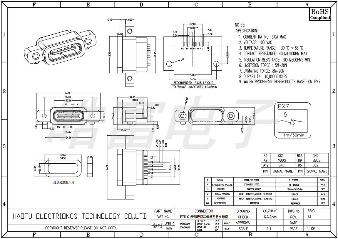 Waterproof TYPE C 6PIN sinking plate with double ears 1