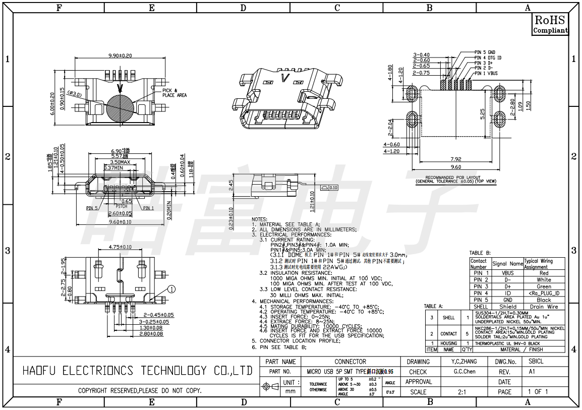 MICRO USB 5P SMT TYPE angled countersunk board 0.95 1